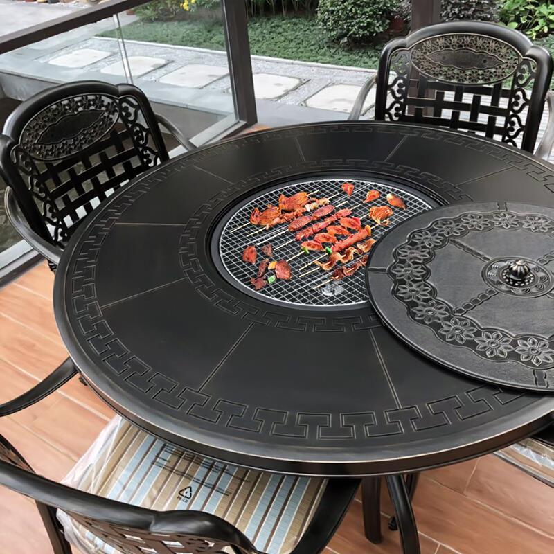 Outdoor Barbecue Table And Chair Combination Courtyard Terrace Garden European Iron Furniture 4 PVC Bordeaux Chairs + 120cm Carved Carbon Baking Table
